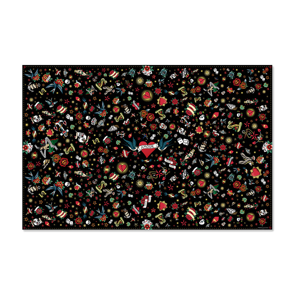A vinyl rug with tattoo designs and rock'n'roll style